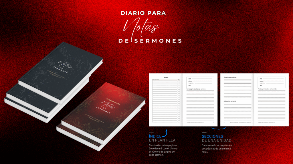 - Índice organizado: Al comienzo del diario encontrarás un formulario de índice con campos para registrar el título y el número de página de cada sermón, para que puedas encontrar tus anotaciones con facilidad.